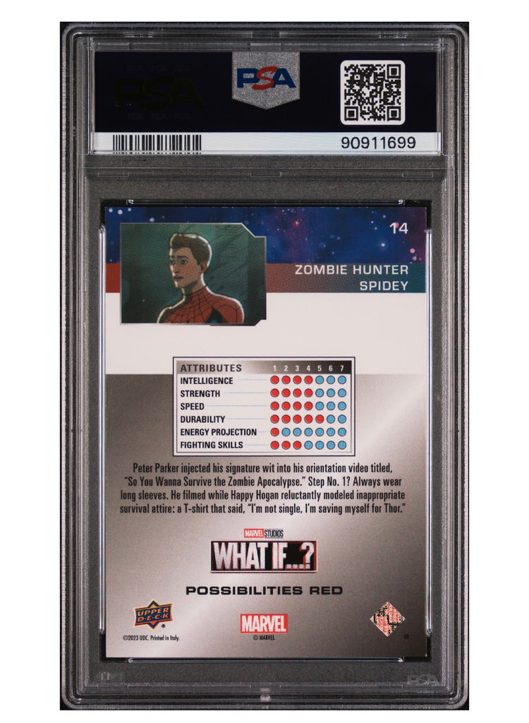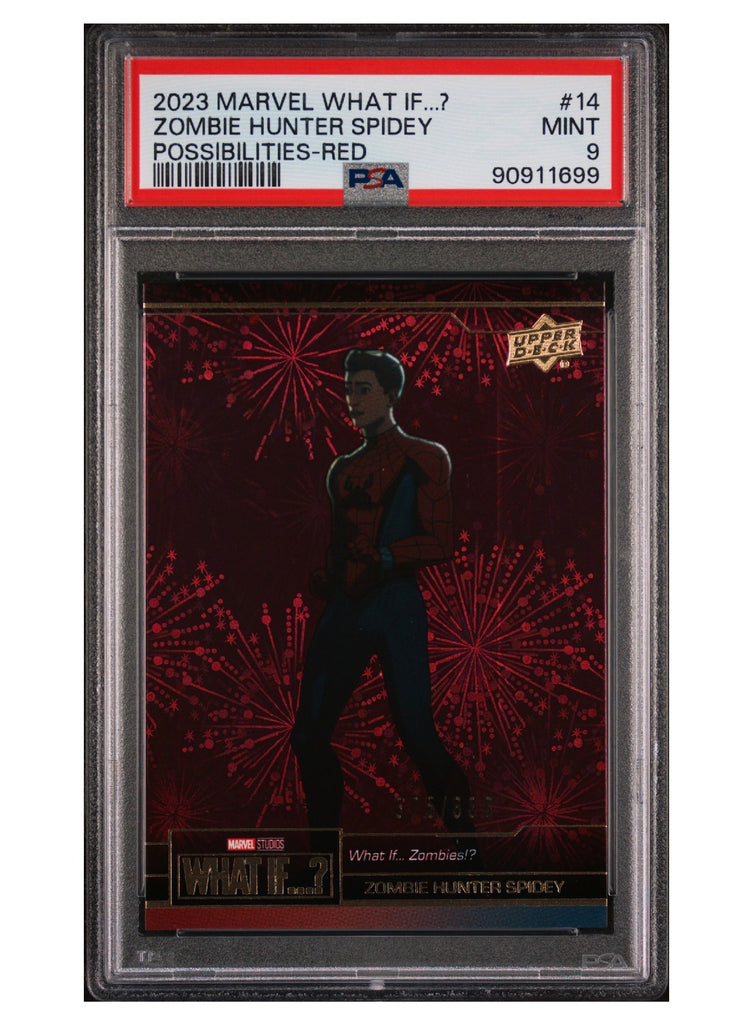 2023 UPPER DECK MARVEL WHAT IF...? #14 ZOMBIE HUNTER SPIDEY POSSIBILITIES-RED 375/888